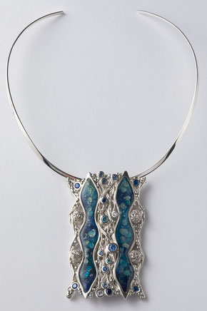 水の流れが、球体・さまざな太さの線、起伏などいろいろな要素をとりいれて、小さなジュエリー作品のなかに豊かな表情を創り出している。長方形で縦長のデザインは目に新しいが、洗練されていて落ち着きを感じます。アート作品でありながらも身に着けたい気持ちにかられる作品で、芸術性と実用性が絶妙のバランスで表現されています。