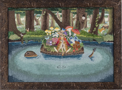 様々なステッチ技法と糸素材が使われており、背景や細部も繊細な手仕事です。主役の猫から背景の森にむけて、配置やグラデーションによって遠近感が見事に表現されています。森の中に見え隠れする生き物や水面の波紋の表現など見るたびなにか発見があり、とても楽しい気持ちになりました。技術・構図・表現力・デザイン全てにおいて素晴らしい作品です。